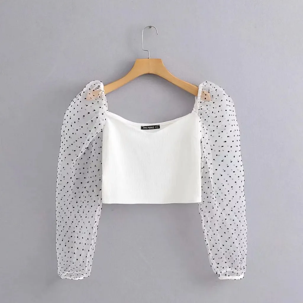 Transparent Polka Dot Jacquard Puff Sleeve Top -