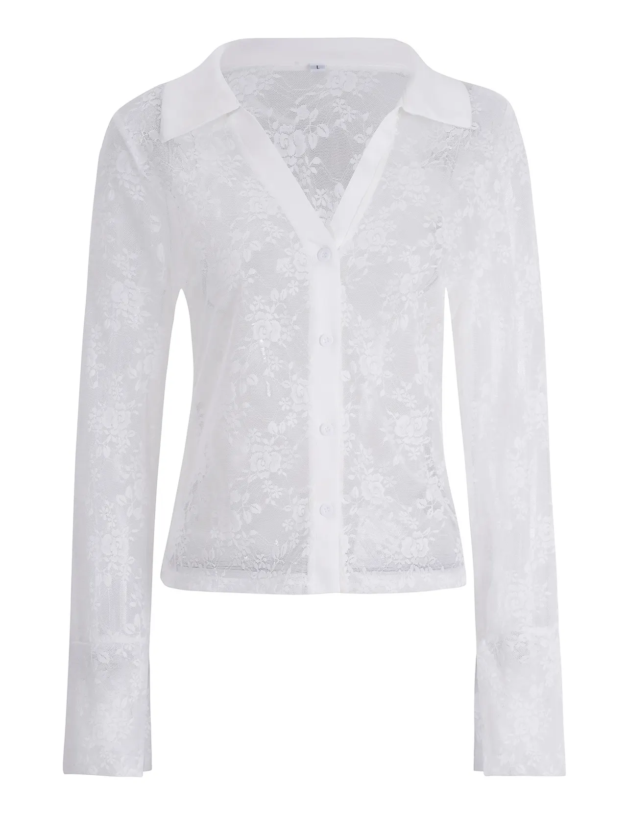 V Girl Style Hollow Lace Cardigan Long Sleeve Top Clothing - White