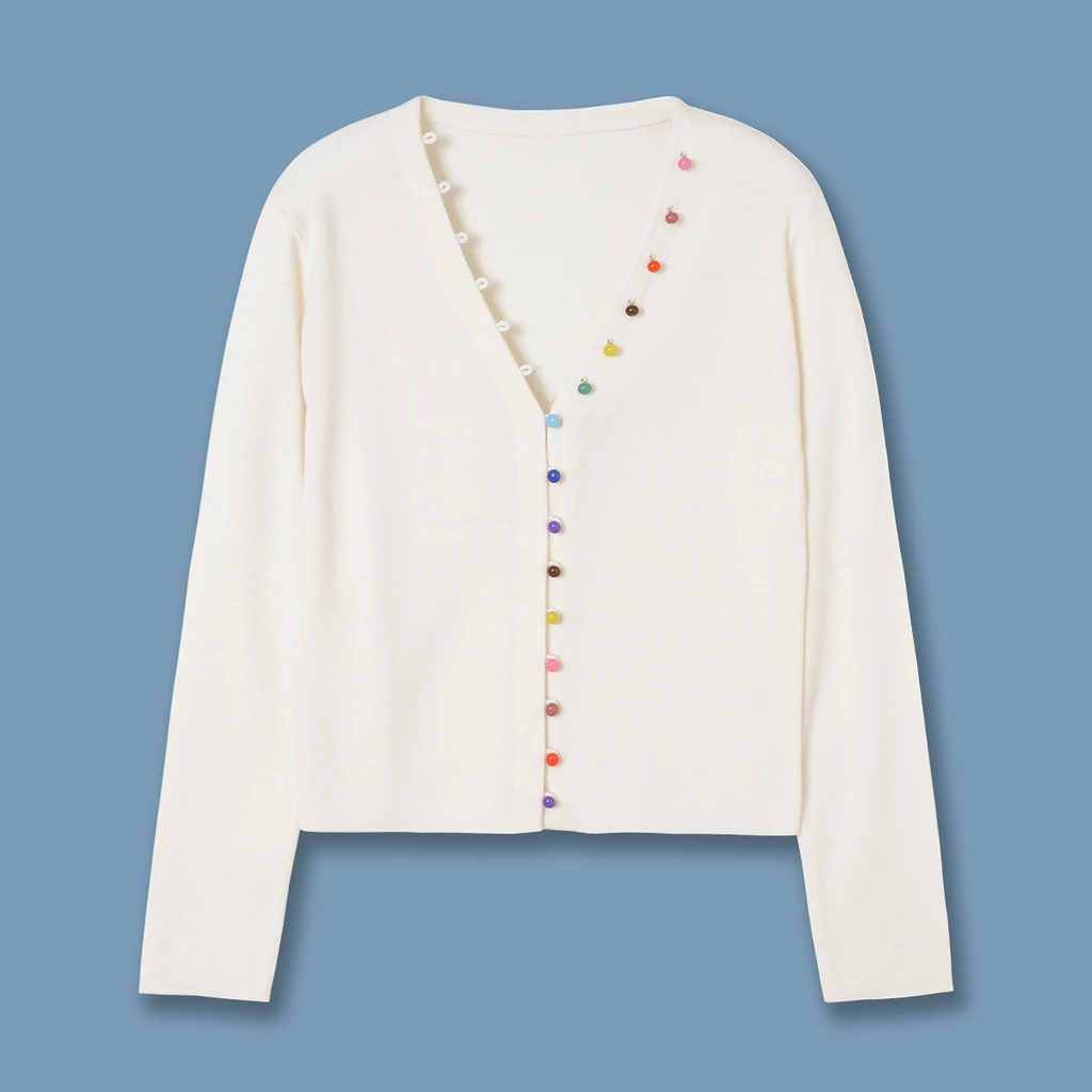 V-neck White Wool Cardigan 24 Years Spring Rainbow Buckle Knitted