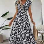 Vacation Style Printed V-neck Large Swing Dress - Gray