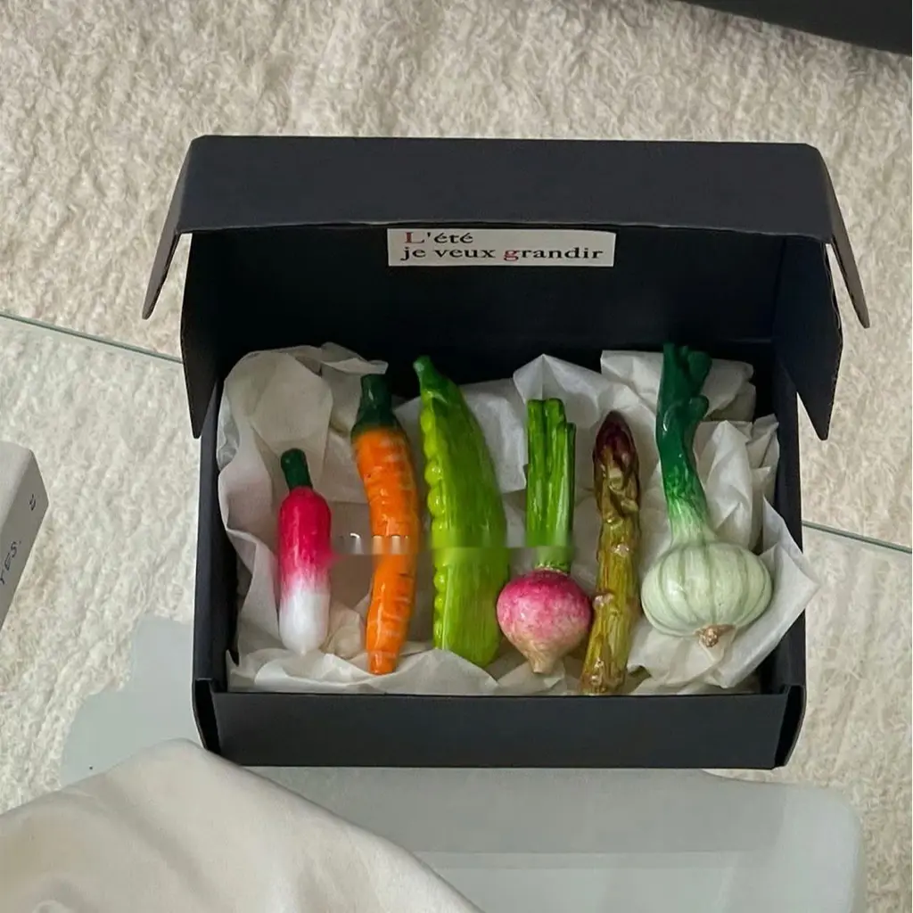 Product information: Material: Resin Craftsmanship: Pure handmade painting Function: Chopstick holder, decorative ornaments, shooting props, etc Size: Irregular about 6-9cm Color classification: Black gift box: 6 vegetable party combinations, vintage green gift box: 6 vegetable party combinations, ins pink gift box: 6 vegetable party combinations, flip light pink gift box: 6 vegetable party combinations, flip light green gift box: 6 vegetable party combinations, cutlery rack 6 vegetable combinations (New Year gift box set), 6 cutlery rack mushroom combinations (New Year gift box set) Packing list: Tableware Stand *6 x1set Product Image: