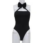 Velvet Bow Solid Color Sexy Halter Backless Bodysuit - Black