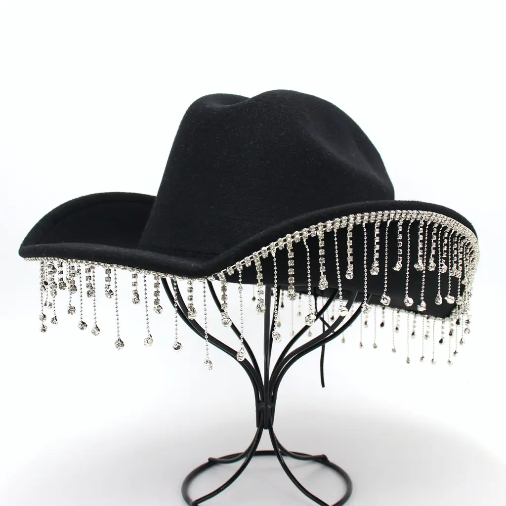 Warped Top Hat With Diamond Tassel Western Cowboy Hat - Black