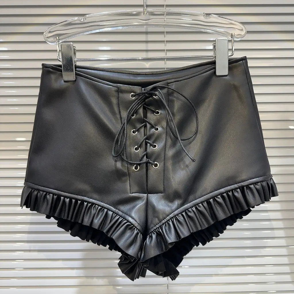 Winter Dark Pleated Lace Drawstring Strap Pu Leather Short - Black