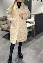 Winter Rhombus Stitching Coat Warm Solid Color Pocket Lapel Long