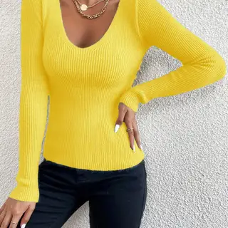 Winter Long Sleeved Knitting V-neck Pullover - Yellow