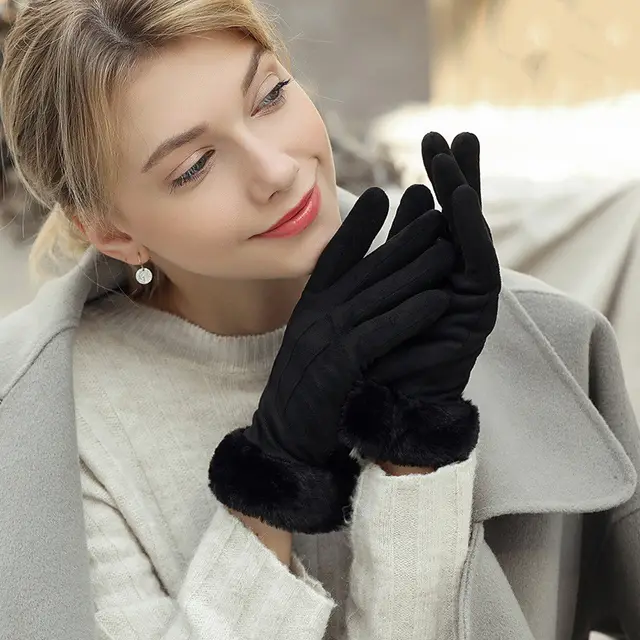 Touch Screen Plus Suede Warm Ski Gloves - Black Double Fleece