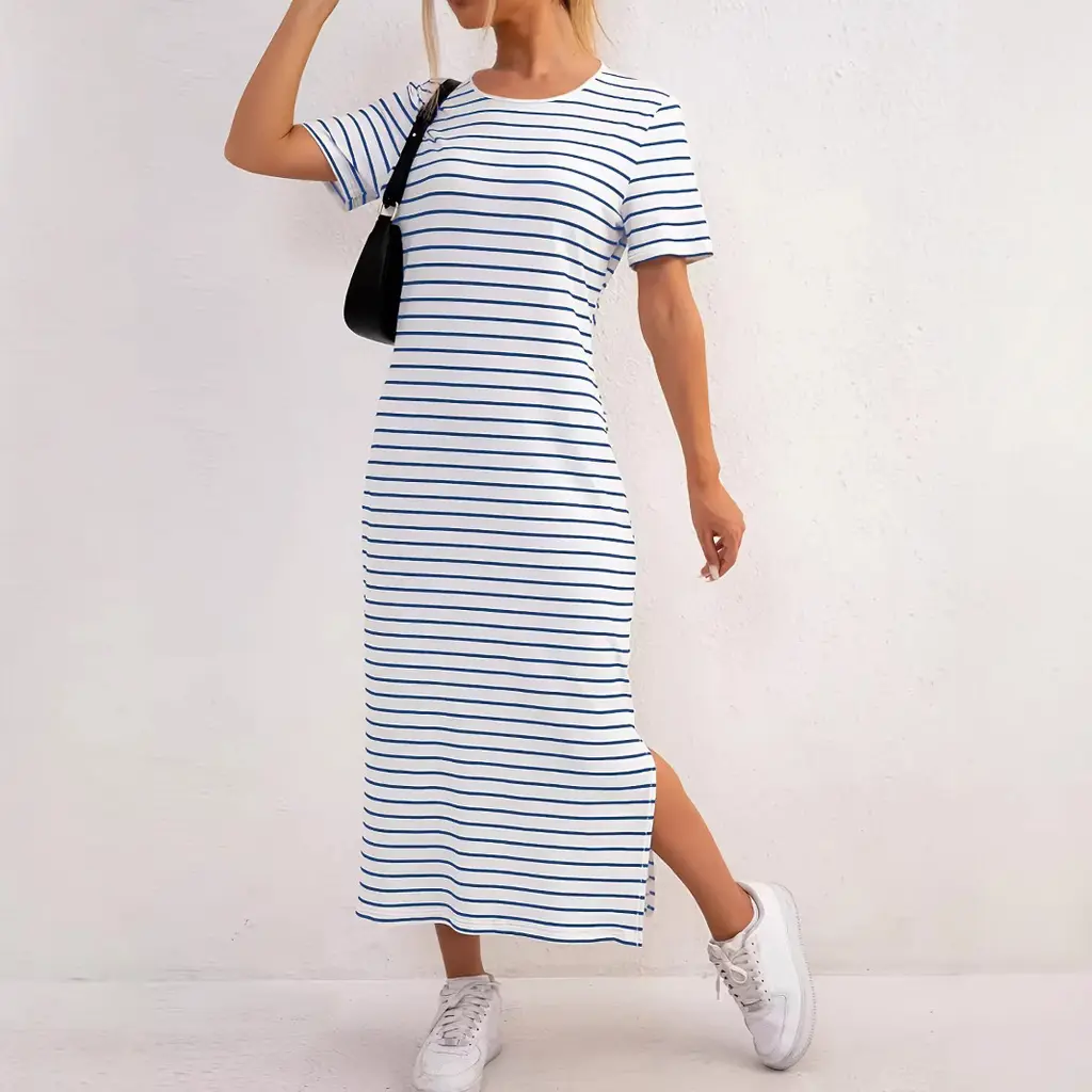 Black And White Striped Dress Short Sleeve Floral Print Slit - Blue