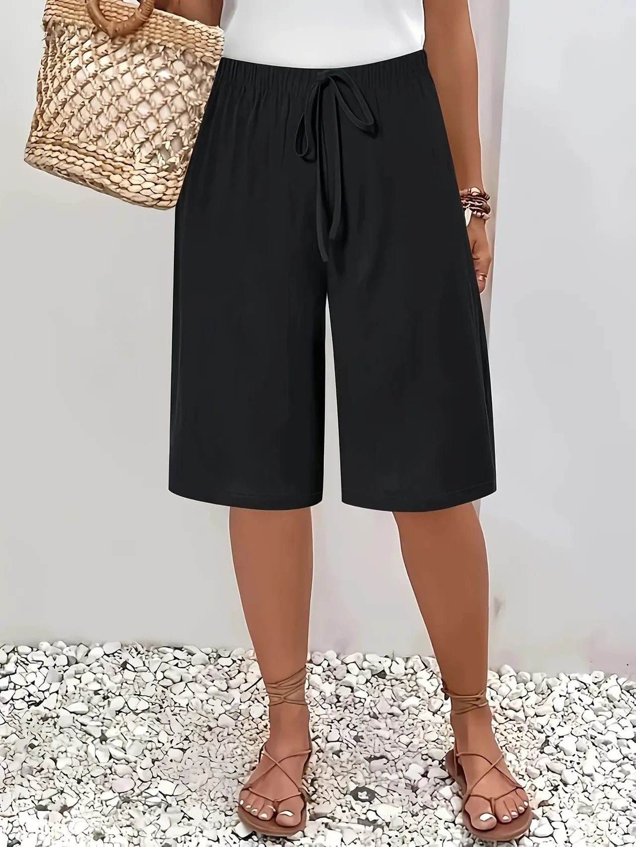 Solid Color Cropped Pants - Black