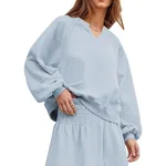 Lace Lantern Long Sleeve Solid Color Loose Top - Blue