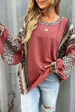 Shirt Contrast Color Striped Round Neck Sleeve Loose Sweater - Red
