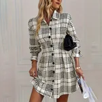 Elegant Plaid Shirt Dress | Ruched Waist A-Line Mini with Long Sleeves Discover the perfect blend of classic and chic with our Women's Elegant Plaid Shirt Dress. This versatile mini dress combines the timeless appeal of a button-down shirt with a flattering A-line silhouette. Featuring a defined ruched waist for a cinched-in look and elegant long sleeves, it's your go-to outfit for the office, a casual date, or a stylish day out. Effortlessly transition from day to night in this sophisticated and comfortable piece. Key Features: Figure-Flattering Ruched Waist: The ruched detailing at the waist creates a beautifully defined silhouette, accentuating your curves. Timeless Plaid Pattern: A classic plaid print adds a touch of sophistication and works seamlessly for both casual and business casual settings. Playful Modern A-Line Mini: The A-line skirt flows away from the body, creating a fun, flirty, and universally flattering shape. Versatile Shirt Dress Design: The classic button-down front and collared neckline offer a polished look that can be dressed up or down with ease. Effortlessly Stylish: Simply pair with boots or heels and you have a complete, put-together outfit suitable for a variety of occasions. Details: Style: Elegant, Casual, Business Casual Features: Plaid Print, Button-Down Front, Ruched Waist, A-Line Skirt Length: Mini Occasion: Office, Date, Casual Outings, Brunch Material: 95% Polyester,5%Spandex