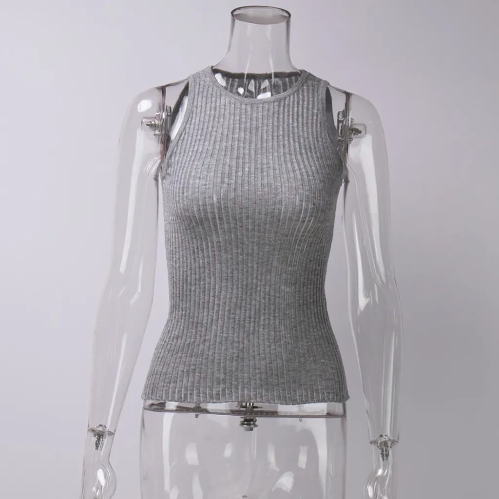 Solid Color Rib Fabric Hollow Vest Slim Sleeveless Knitted Top - Gray