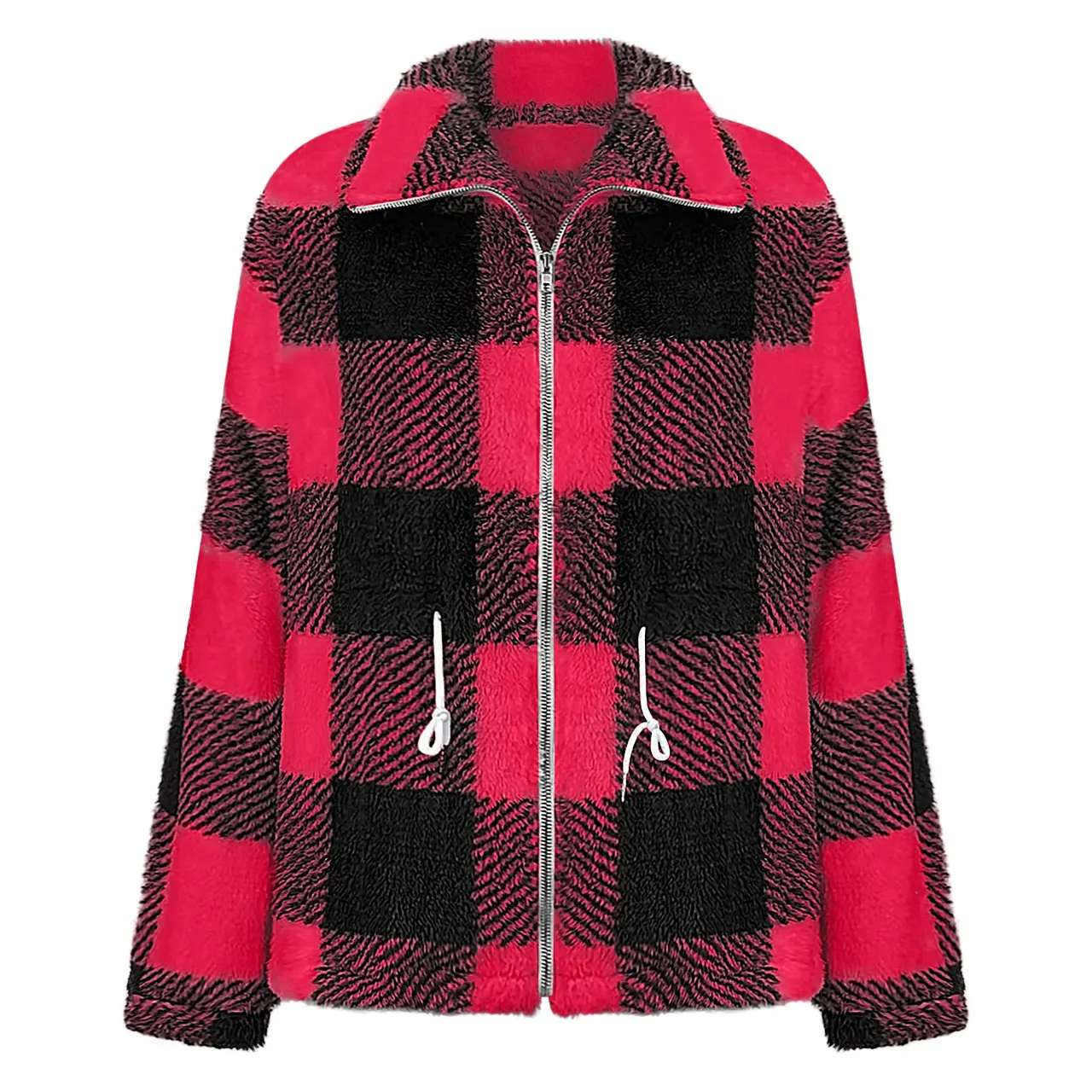 Long-sleeved Plaid Lapel Zipper Plush Coat - Red