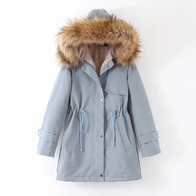 Mid-length Large Fur Collar Thickened Slim Waist Coat Jacket - Blue