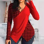 Printed V-neck Stitching Long Sleeve T-shirt Top - Red