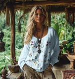 Retro Bohemian Print Cotton And Linen Blend Loose Blouse - Blue