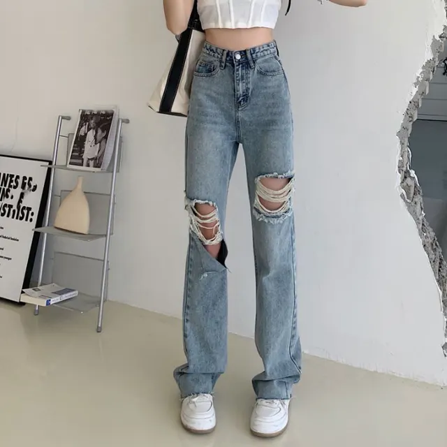 Retro High Waist Straight Ripped Jeans - Blue