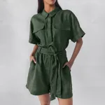 Retro Short Sleeve Lapel Wide-leg Pants Lace-up - Green