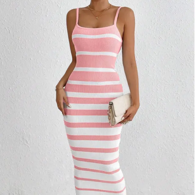 Sexy Striped Spaghetti Straps Hip Dress - Pink