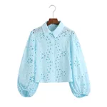 Solid Color Cutout Embroidery Shirt Top - Blue