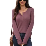 Solid Color Round Neck Button Loose Long-sleeved T-shirt Top - Brick