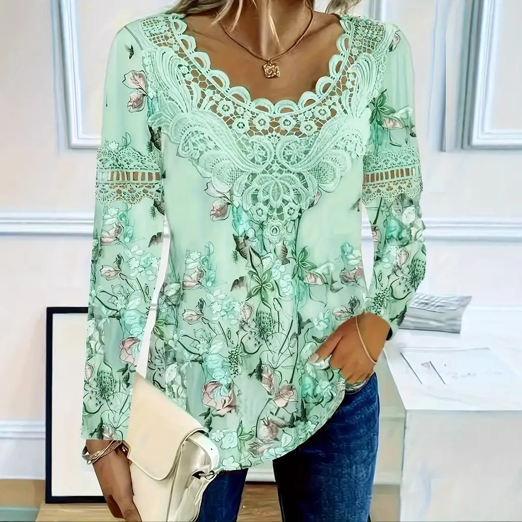 Stitching Lace Round Neck Long Sleeve Top - Green