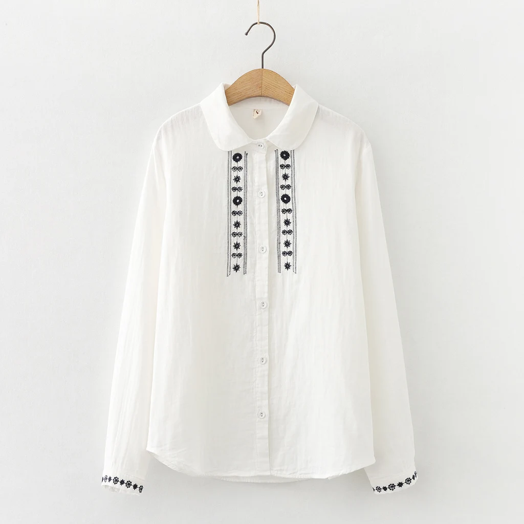 Vintage Embroidered Double Cotton Yarn Long Sleeve Shirt - White