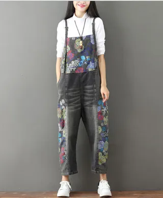 Wide Leg Jeans Full Length Loose Denim Overalls Washed Print Ripped