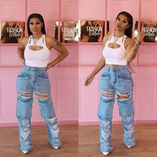 - Style: Women's High Waist Zipper Straight Ripped Jeans