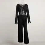 Lace-up Long-sleeve Top And Pants Pajama Set - Black