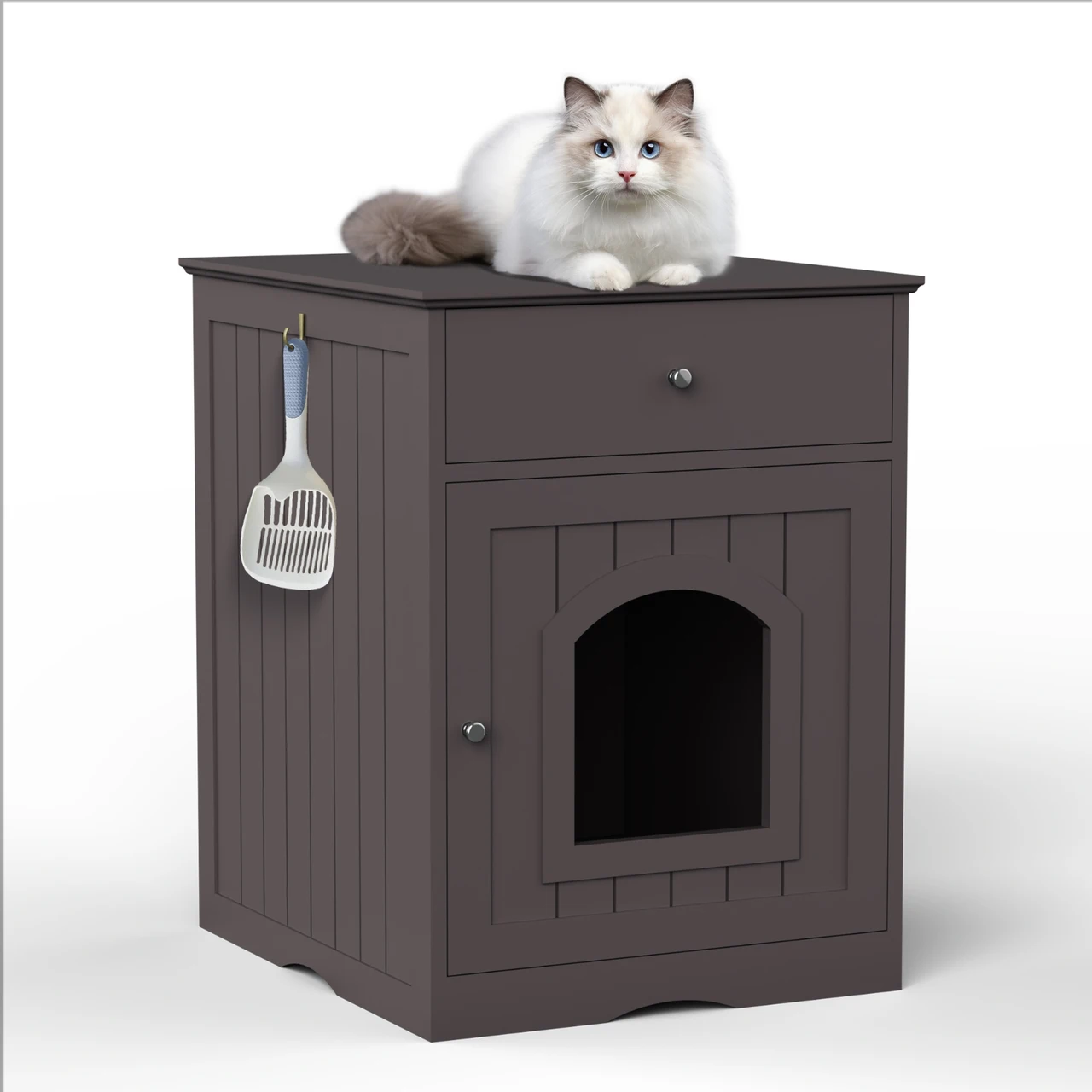 Wooden Pet House Cat Litter Box Enclosure With Drawer & Side Table -