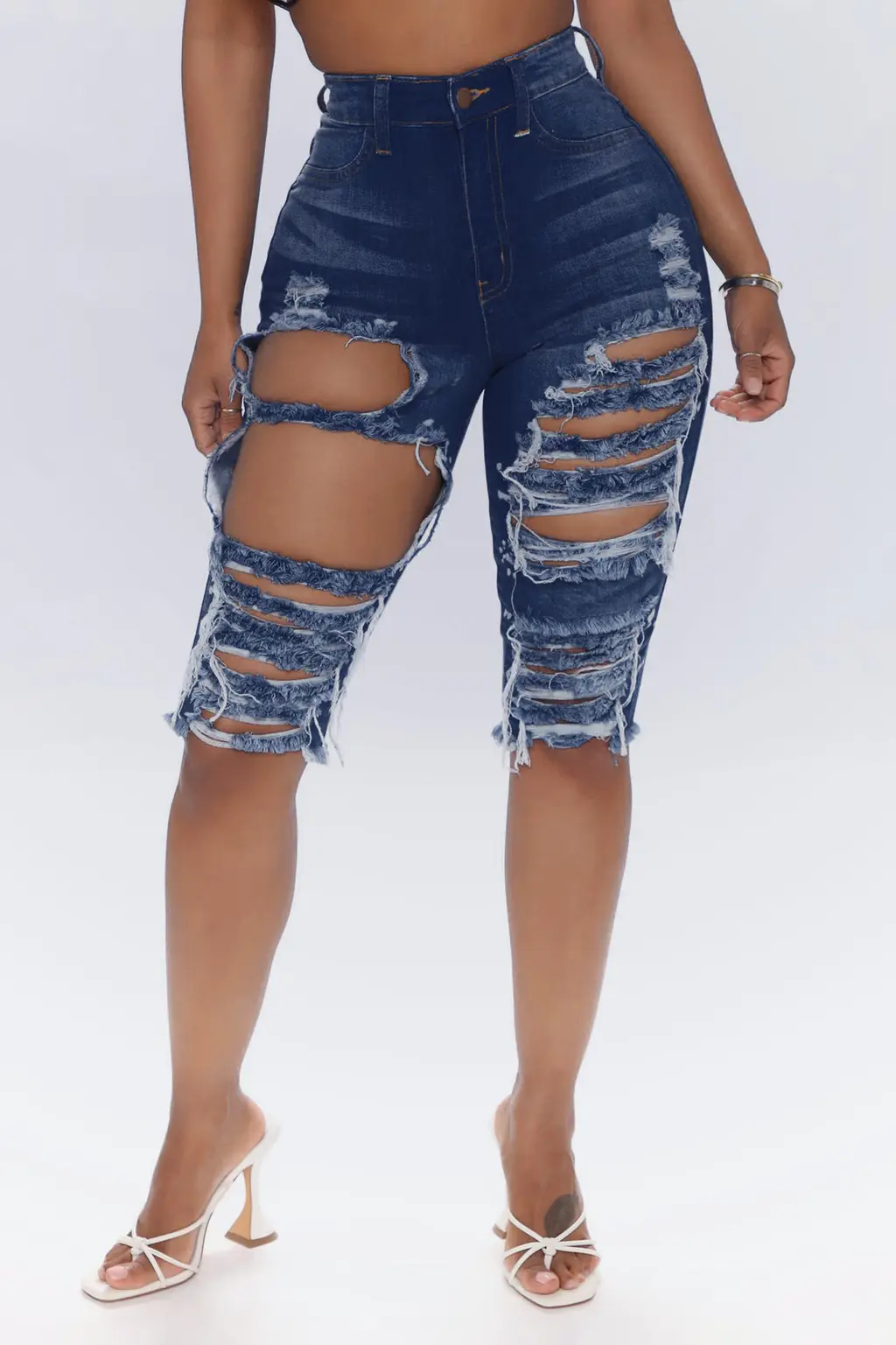 Xia Europe And The United States Ripped Elastic Denim Pants - Dark