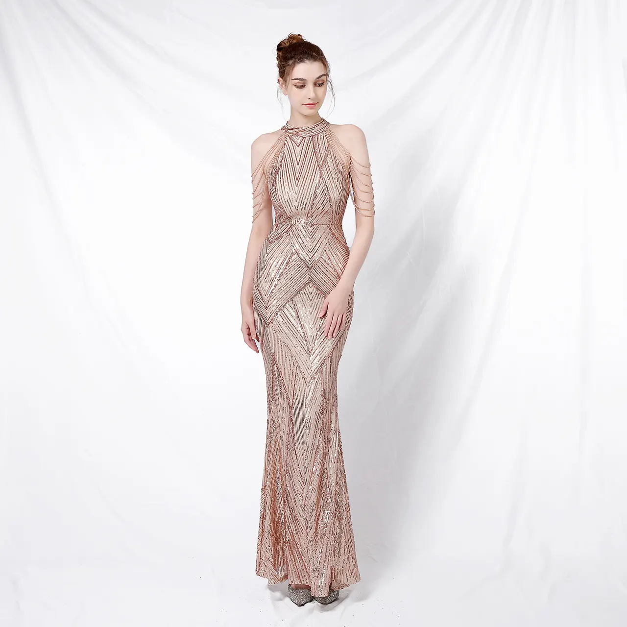 Backless Evening Dress Party Dress Long Wear Sequin Fabric - Gold