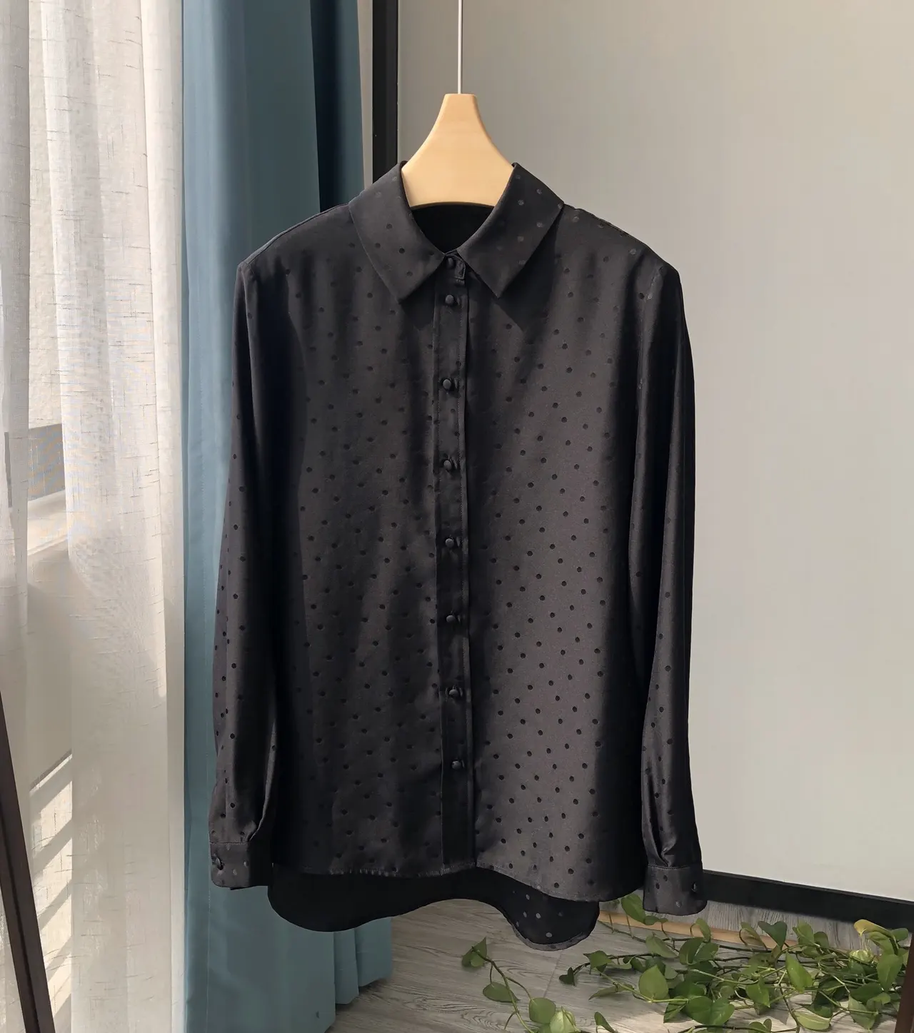 Product information: Pattern: Plain Fabric name: Silk Color: white, black, caramel, Rose Sleeve type: regular sleeve Main fabric composition: Mulberry Silk Size: S,M,L Version: Straight Style type: temperament commute Sleeve length: long sleeve Style: Cardigan Style: commute style Craft: Jacquard Note: 1. Asian sizes are 1 to 2 sizes smaller than European and American people. Choose the larger size if your size between two sizes. differences due to . 2. Please check the size chart carefully before you buy the item, if you don't know how to choose size, please contact our customer service. 3.As you know, the different computers display colors differently, the color of the actual item may vary slightly from the following images. Packing list: Shirt x1 Product Image: