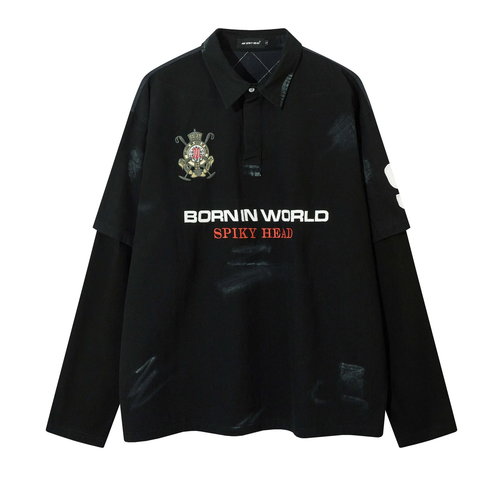 High Color Matching Letters Embroidered Lapel Long Sleeve Top - Black