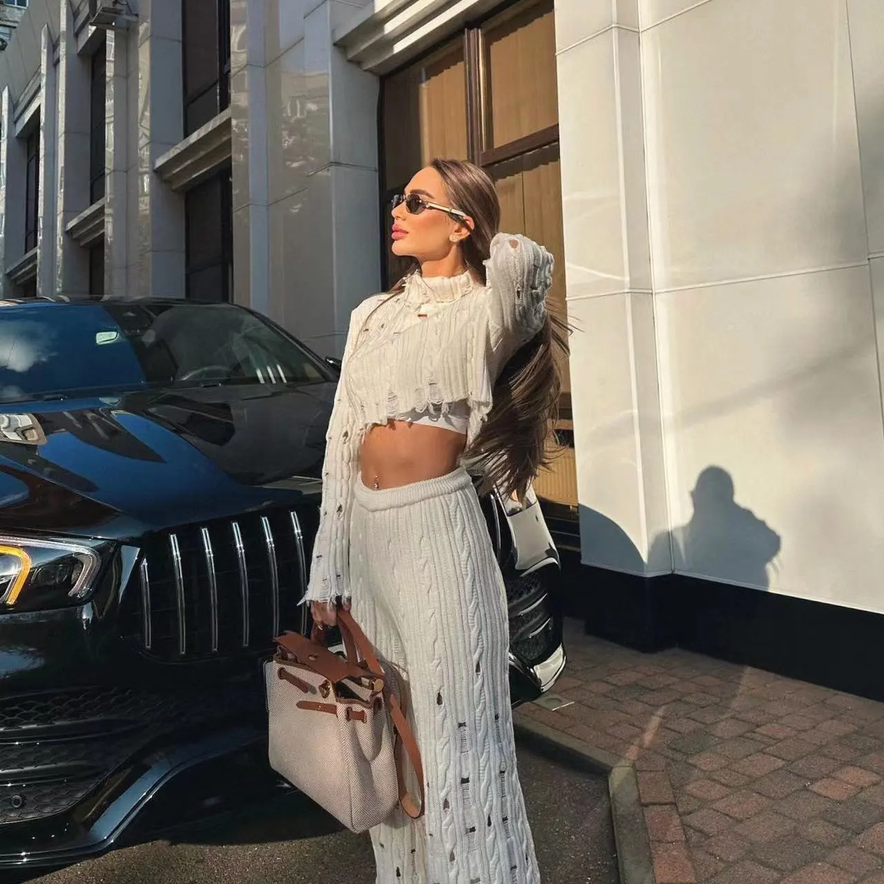 Broken Hole Hollow Knitting Set High Neck With Exposed Edges And