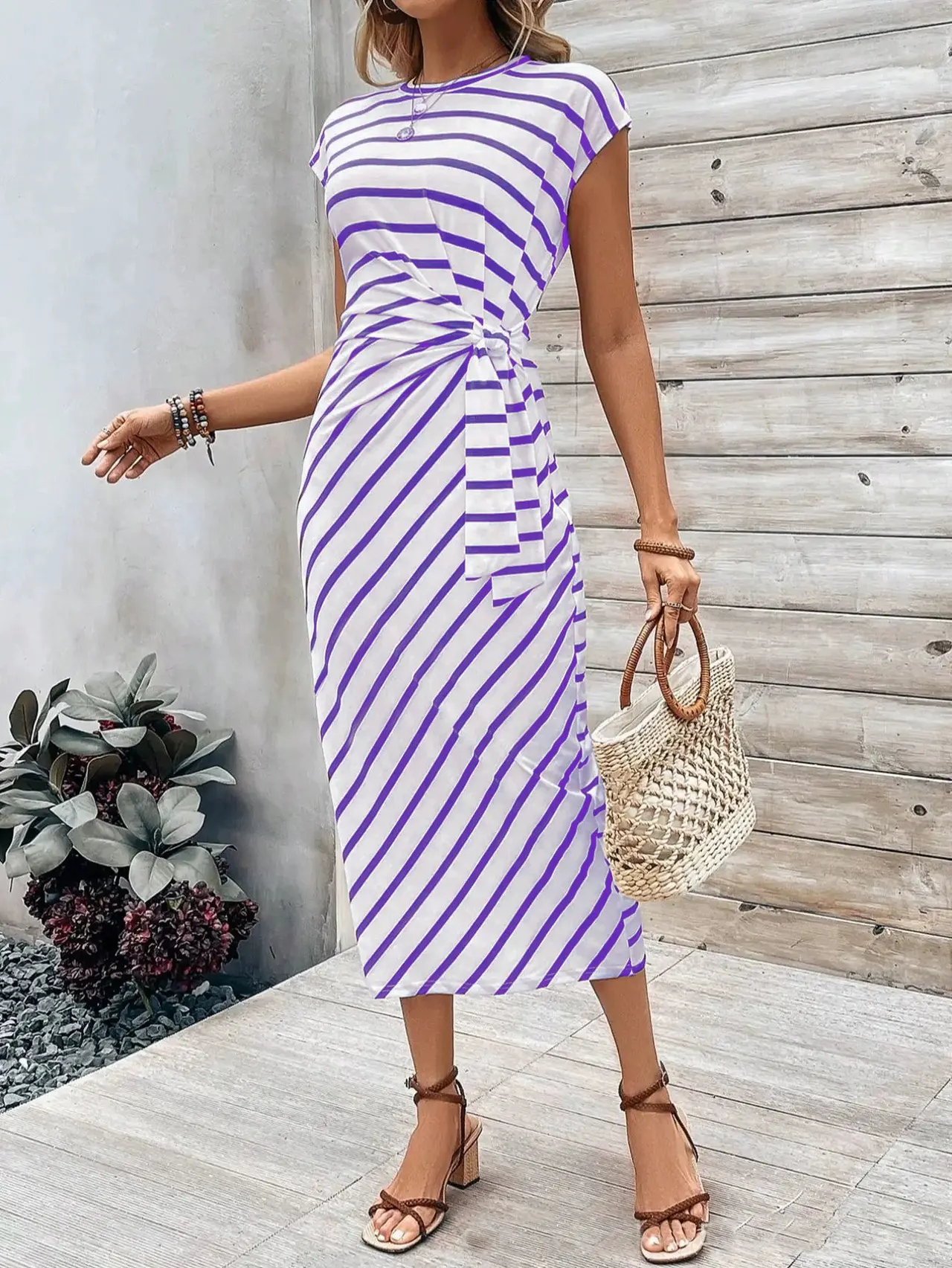 Elegant Waist Strap Striped Round Neck Short Sleeve And Long Pattern Dress - Purple