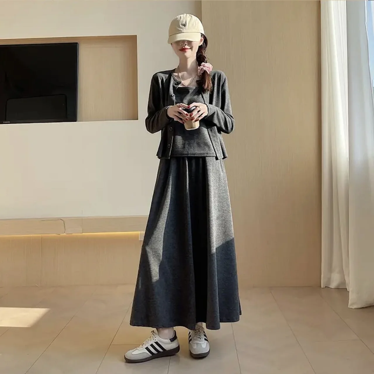 Glutinous Rice Three-piece -style Knitted Cardigan Sling Skirt - Dark