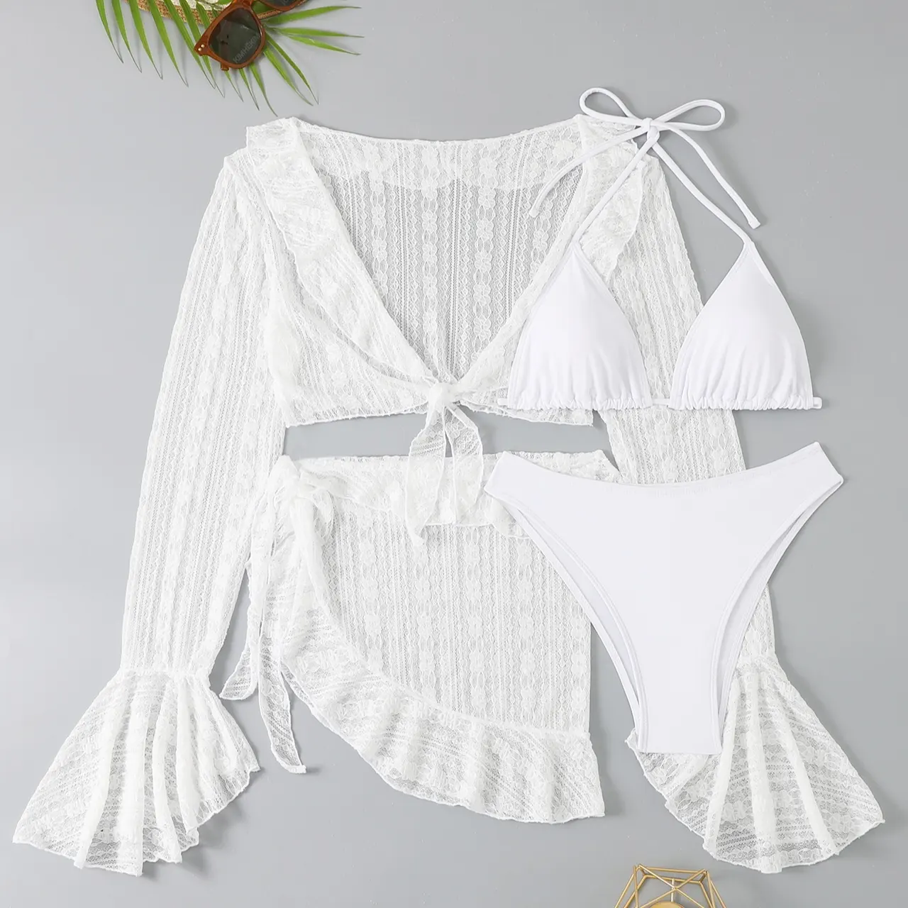 Lace Long Sleeve Cardigan Lace Ruffled Bikini Four-piece Suit