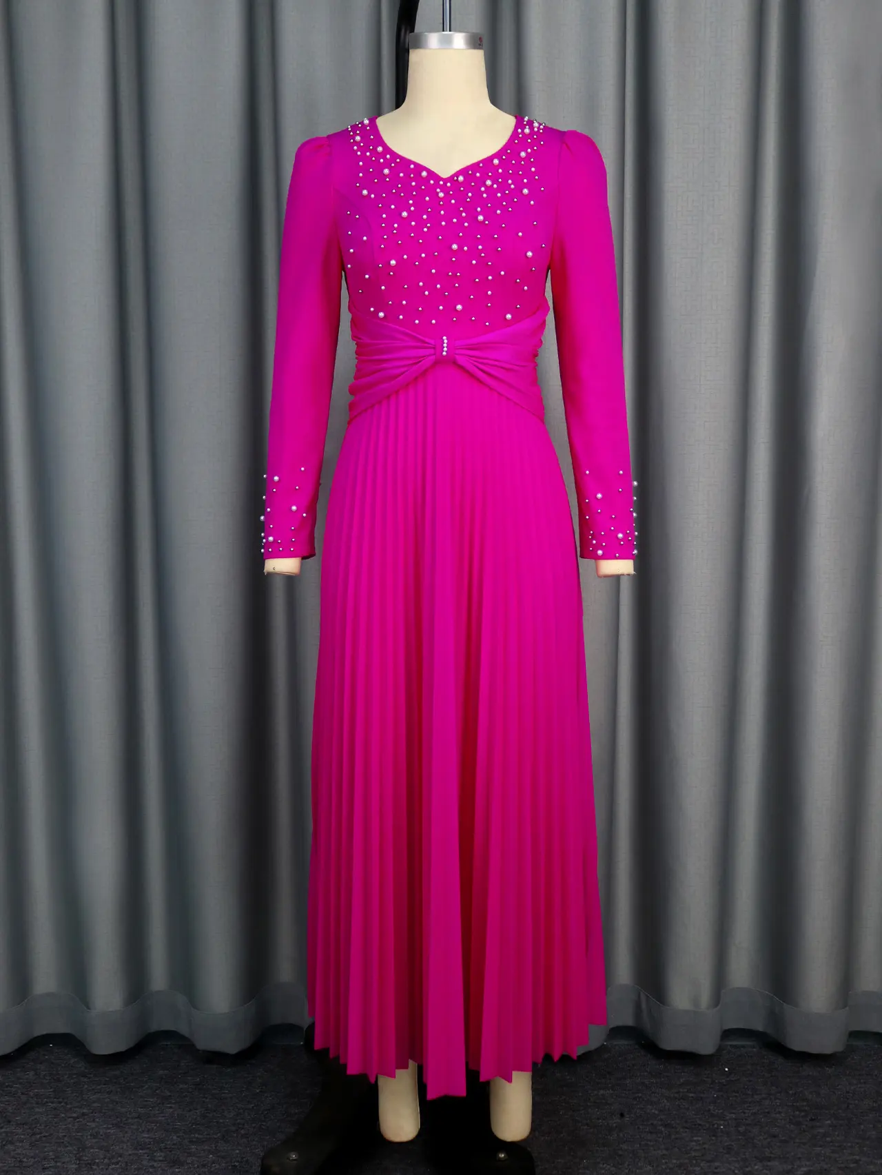 Product information: Pattern: Plain Skirt type: A- line skirt Color: Rose Red Waist type: high waist Size: S,M,L,XL,XXL,3XL,4XL Style type: temperament commute Combination form: Single piece Skirt length: long skirt Popular elements: pleating Style: pullover Fabric name: Polyester Sleeve type: regular sleeve Main fabric composition: Polyester (polyester fiber) Sleeve length: long sleeve Skirt Category: Dress Craft: beaded, pleated Size: Note: 1. Asian sizes are 1 to 2 sizes smaller than European and American people. Choose the larger size if your size between two sizes. differences due to . 2. Please check the size chart carefully before you buy the item, if you don't know how to choose size, please contact our customer service. 3.As you know, the different computers display colors differently, the color of the actual item may vary slightly from the following images. Packing list: Dress*1 Product Image:
