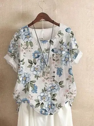 Retro Cotton And Linen Printed Loose Shirt Short-sleeved T-shirt For