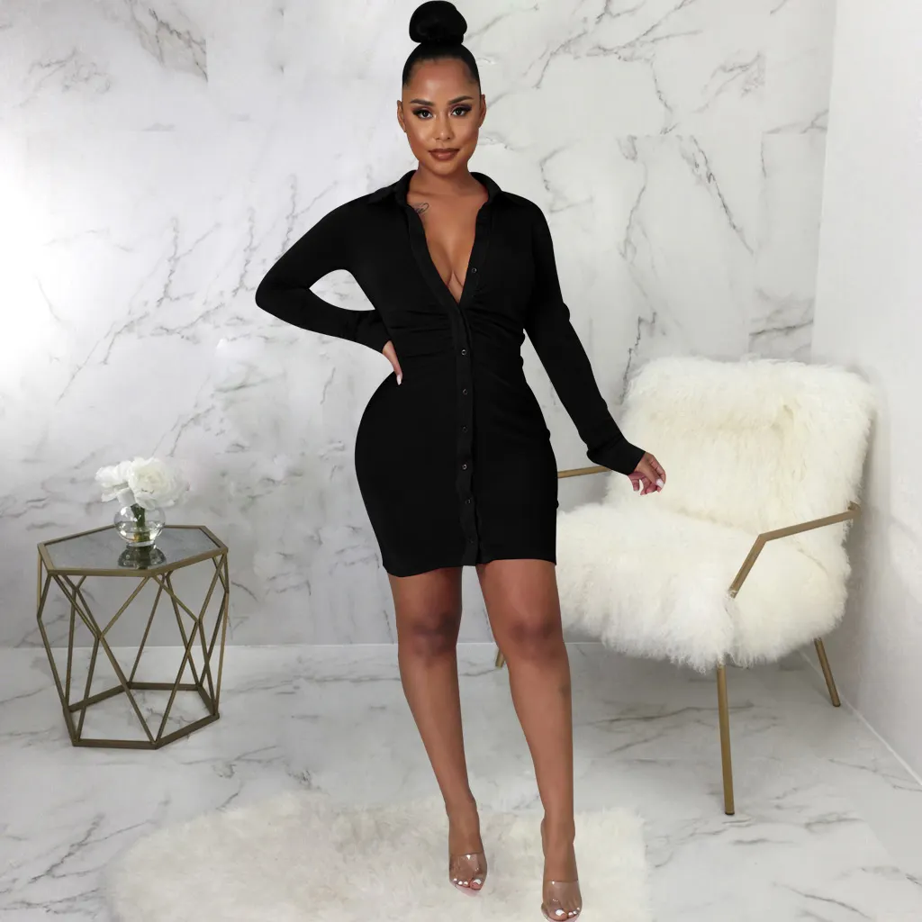 Sexy Solid Color Shirt Dress - Black