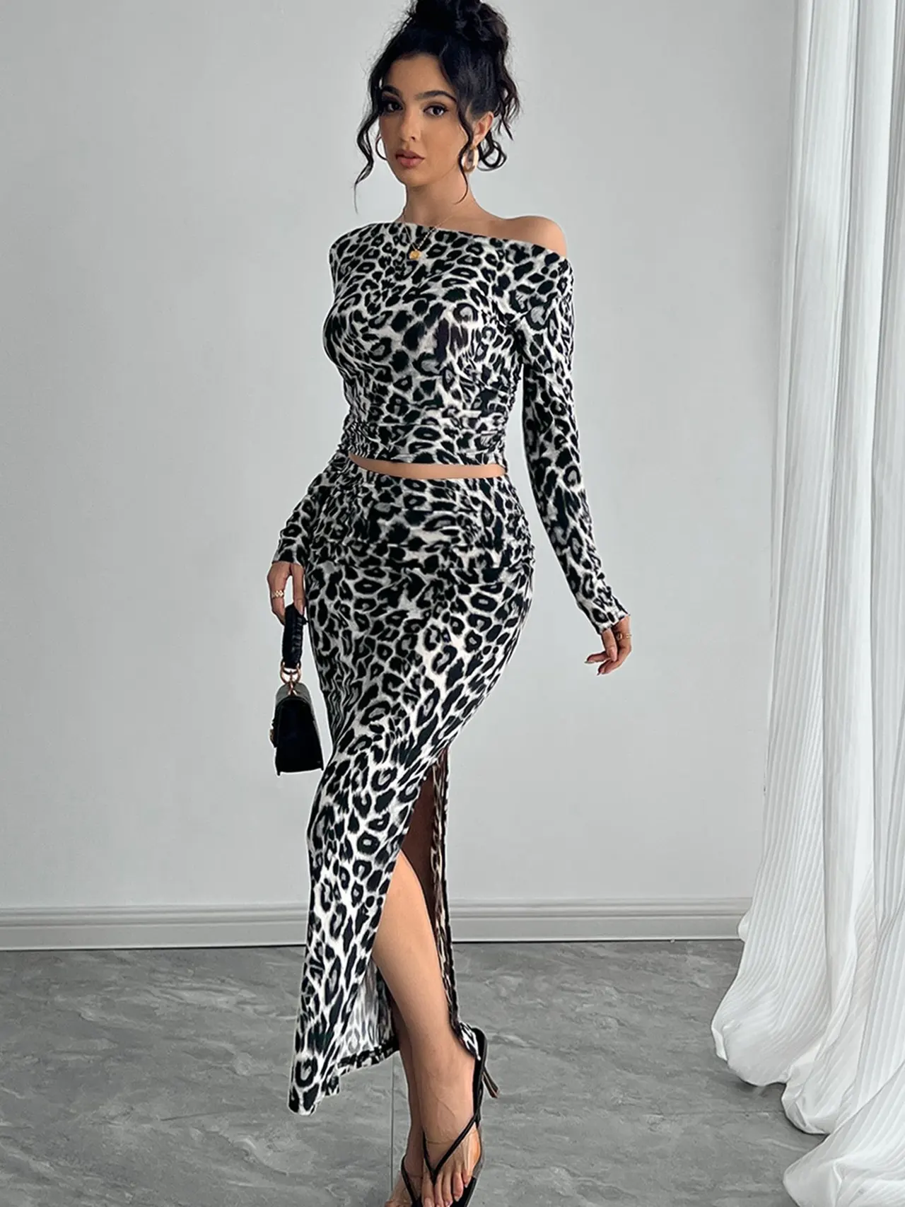 Sexy Leopard Print Two-piece Suit With Fitted Maxi Dress Suit - Gray