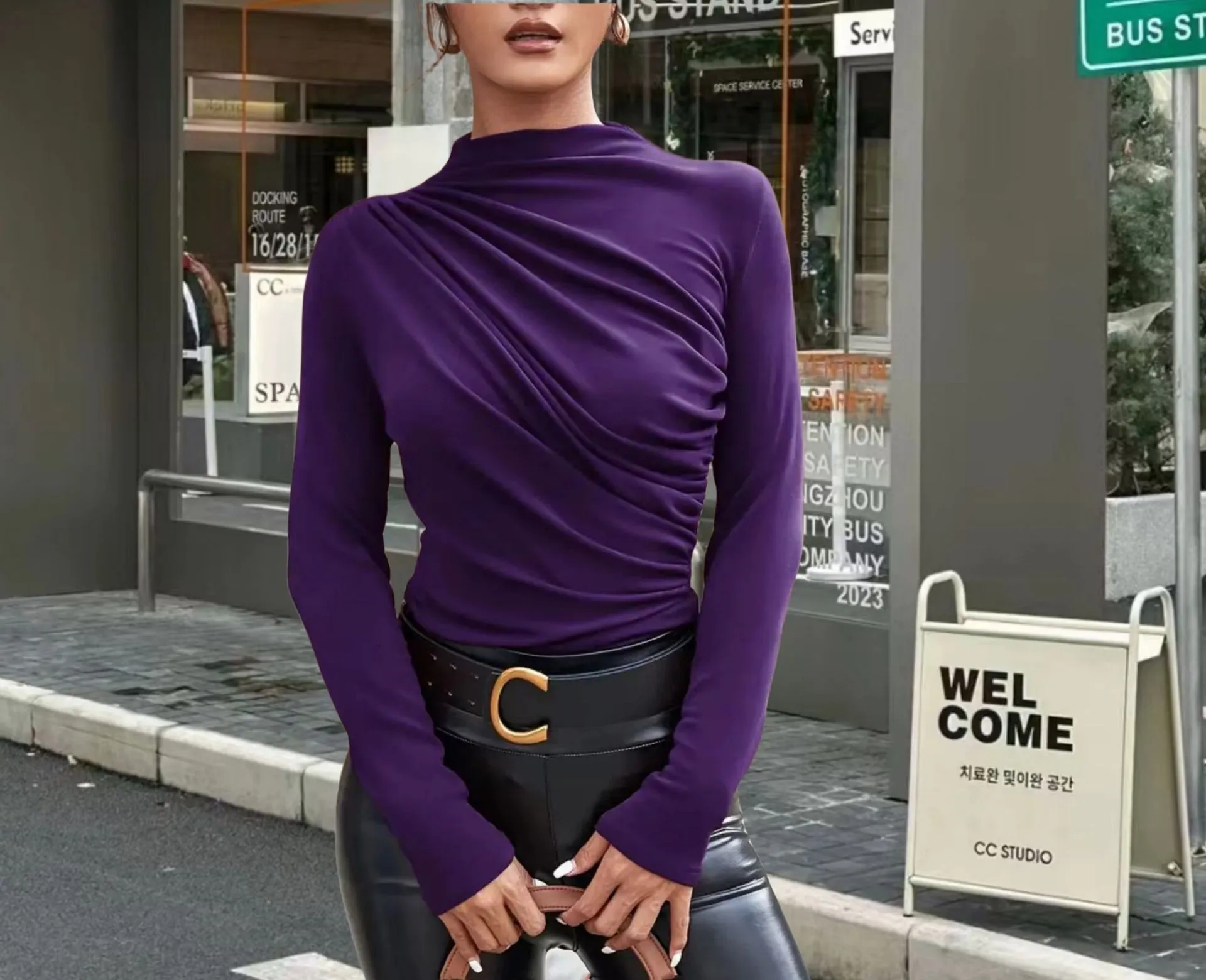 Solid Color Slim Fit Long Sleeves Top - Purple