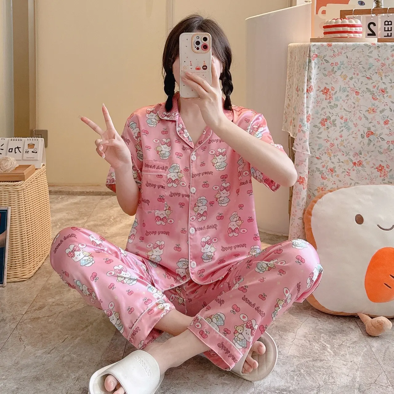 Summer Short Sleeve Lapel Ice Silk Home Wear - 3 Style