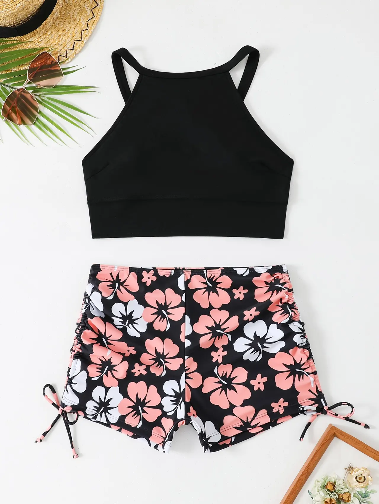Vest High Waist Drawstring Conservative Split Boxers Bikini Swimsuit