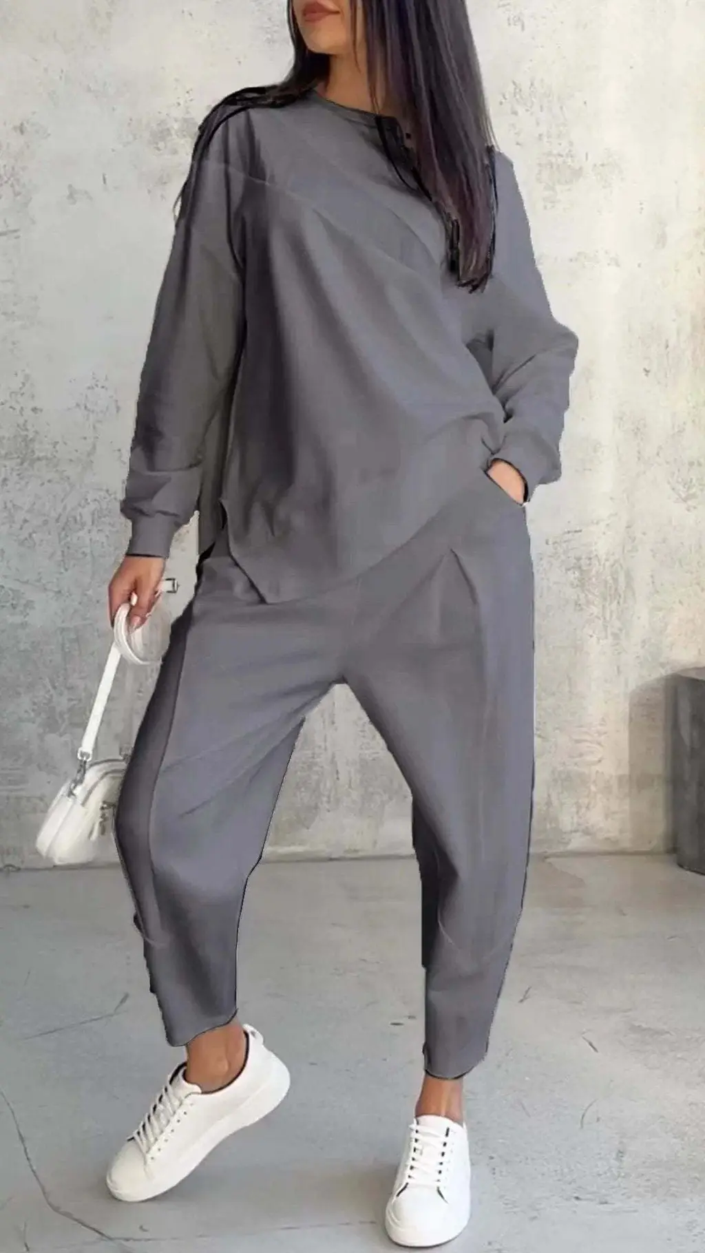 Round Neck Loose And Irregular Long-sleeve Sweater Set - Gray